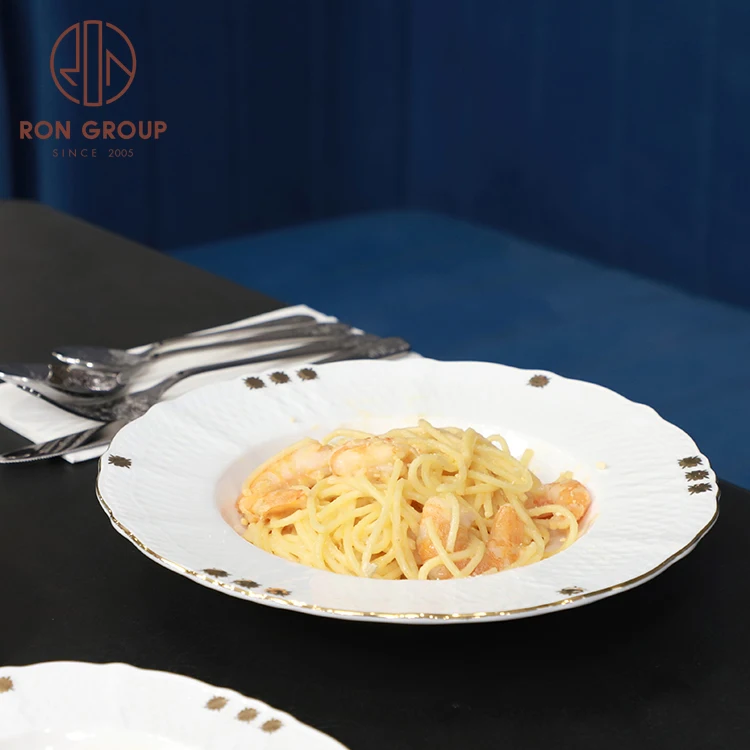 White Embossed Rim Dinner Plate with Gold Dot Accents – Food-Grade Ceramic Tableware for Hotel & Restaurant