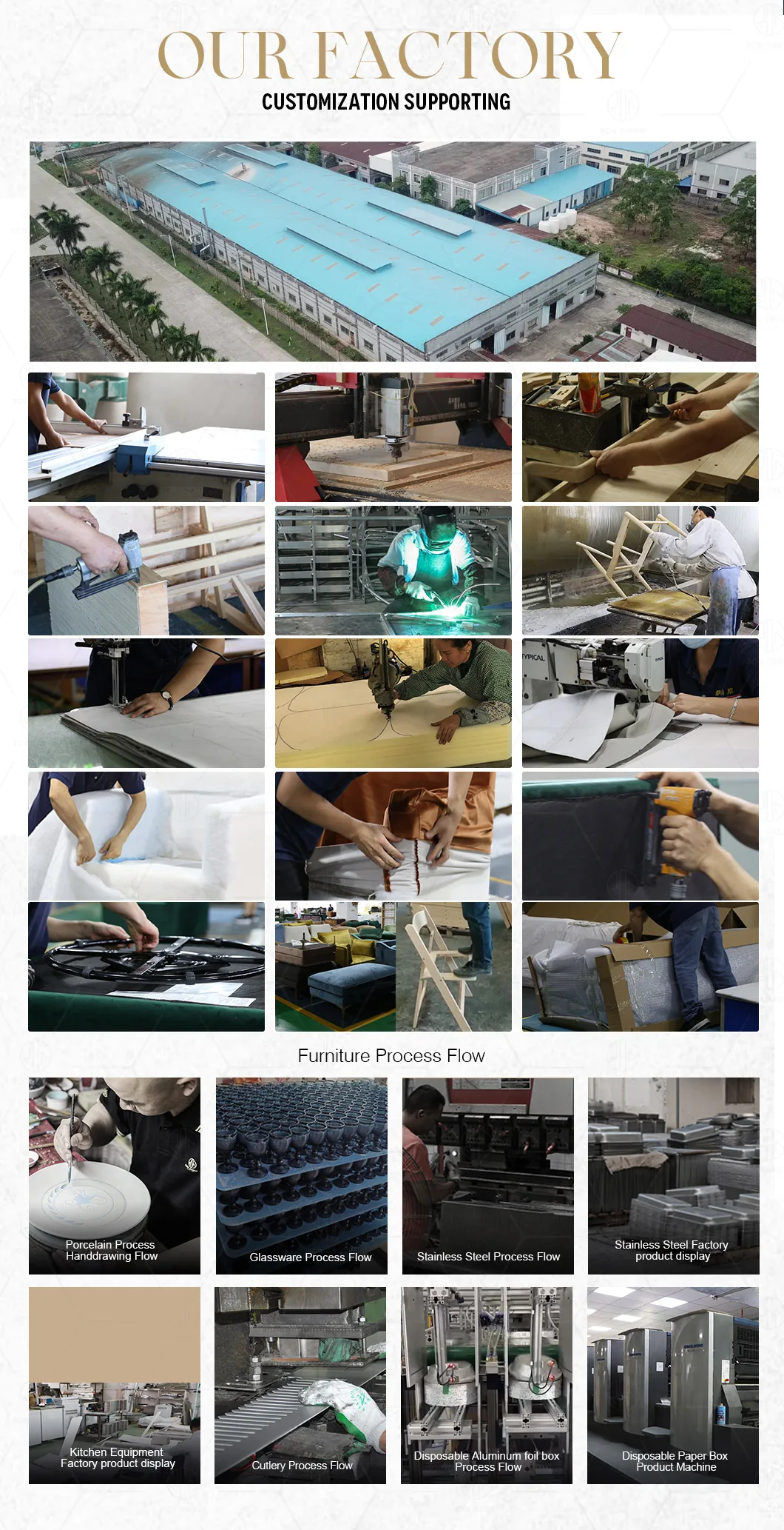 We provide a full range of restaurant support services, including tableware, furniture, kitchenware, kitchen equipment, barware, buffet equipment, uniform, decoration, disposable product, lighting and etc. Additionally, we offer restaurant layout design, logistics and transportation, risk management, restaurant consulting, and franchise services.