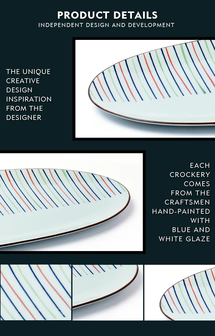 • wholesale restaurant blue stripe unique design tableware fish dessert ceramic dinnerware oval japanese plate
