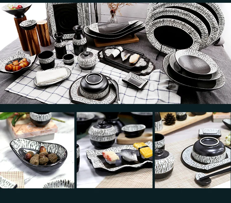 • Japanese Style Hotel Restaurant Black Custom Printed Dinnerware Tableware Set Salad Soup Tray Bowl Ceramic Ramen Rice Bowl
