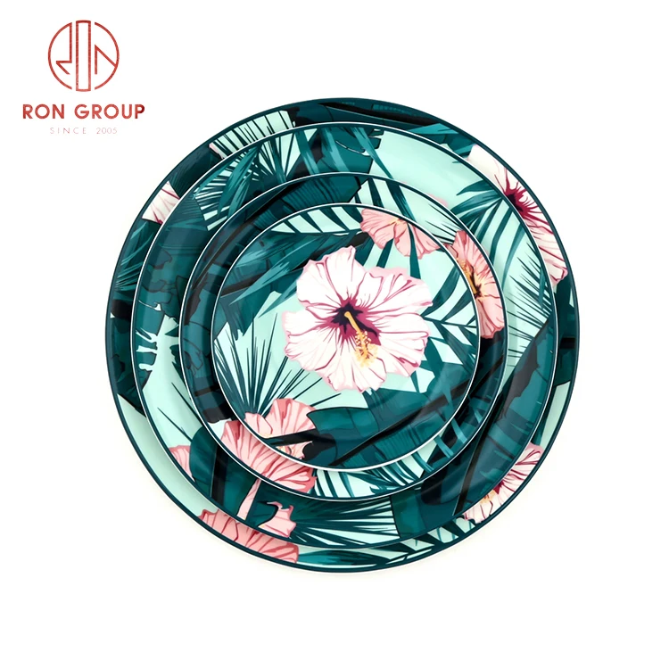 wholesale green tropical plant red flower pattern serving charger plates fine bone china dinnerware ceramic plate