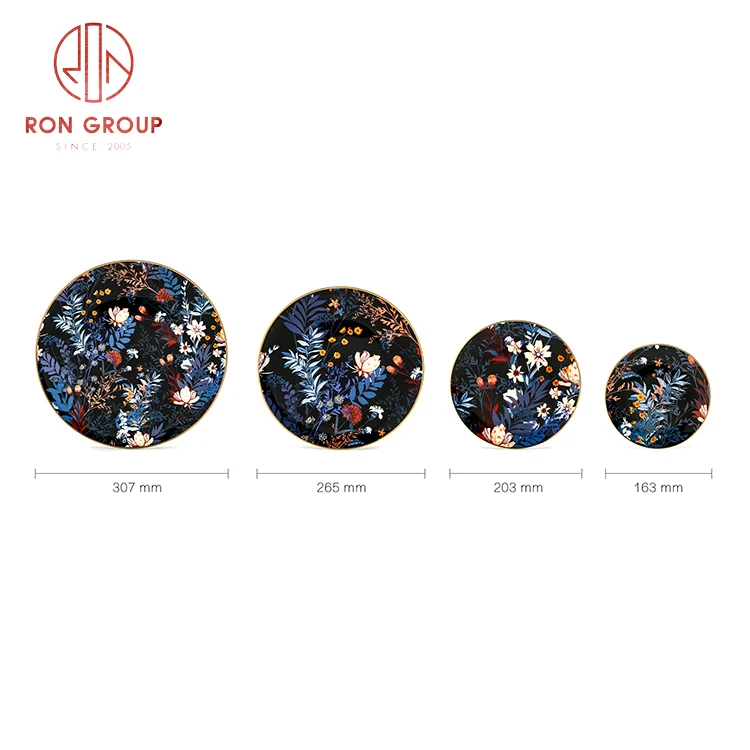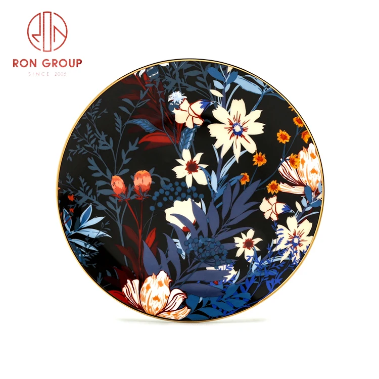 • customized dinnerware gold rim fancy pattern dinner plate bone china restaurant steak dessert black ceramic charger plates
