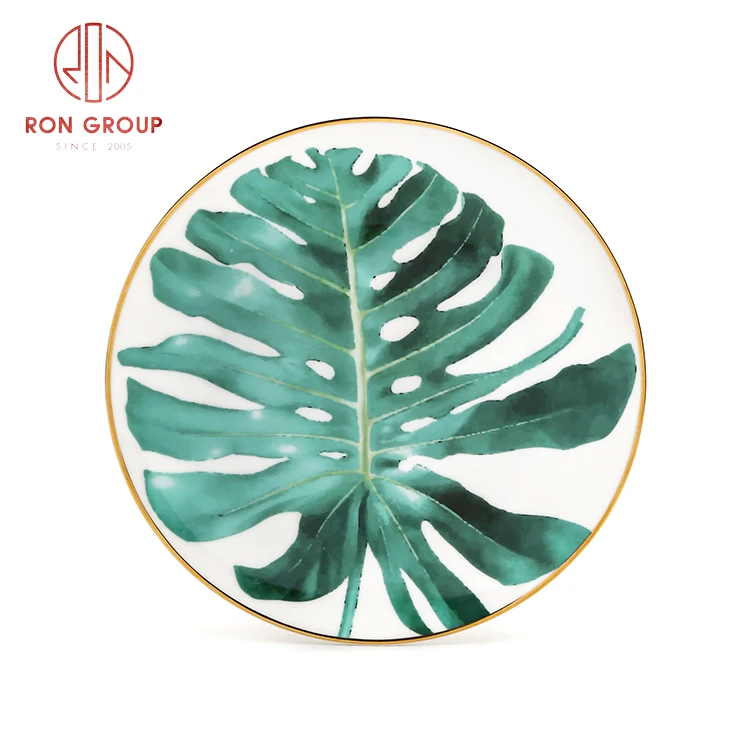 wholesale catering bone china dinner plates gold rim green plant pattern restaurant white plates sets dinnerware