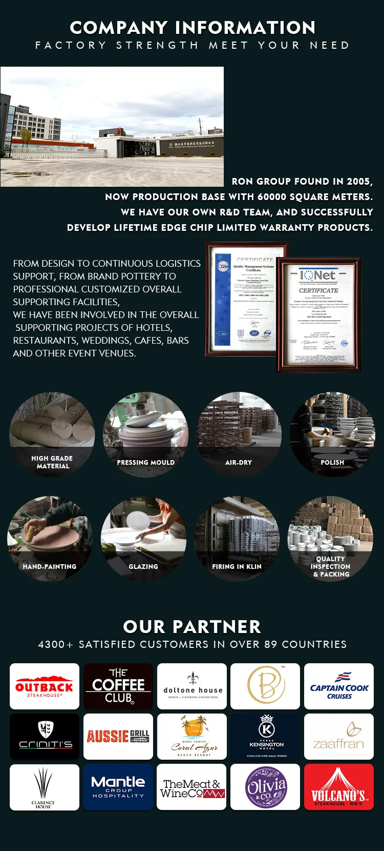 Q:What are the advantages of Ron Group? 1. Save more than 65% cost. 2. More than 75% product have stock. 3. Professional design and custom-made products. 4. 14+ Years restaurant overall supporting experience. 5. 89 cooperative countries. 6. 4300+ client. 7. Minimum MOQ. 8. Form Factory direct to customer. 9. China No.1 company can ensure lifetime warranty on any lip edge chip.
