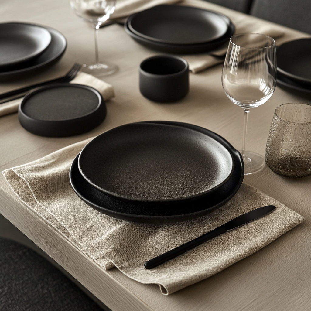 Matte ceramic plates come in charcoal black, sand beige, ivory white, moss green, and speckled neutral tones. These shades work with Scandinavian, rustic, industrial, or Japanese interiors.